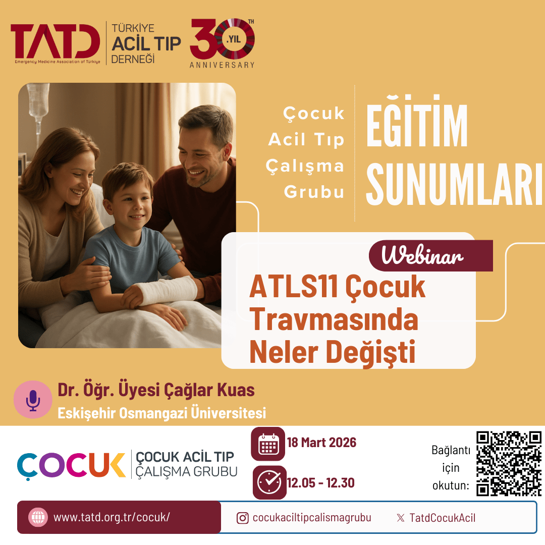 Eğitim SunumlarıEtkinlikSlider Webinar: ATLS11 Çocuk Travmasında Neler Değişti tarafından Bahadır Arslan 4 Mart 2026 written by Bahadır Arslan 4 Mart 2026 0 yorumlar 90 Eğitim sunumlarımıza son ATLS güncellemeleri ile devam ediyoruz. Webinar Kaydı Cocuk Acilwebinar 0 FacebookTwitterPinterestE-posta Bahadır Arslan Keşan Devlet Hastanesi previous post TATD Ulusal Resim Yarışması – 2026 next post ACİL SERVİSTE GİRİŞİMSEL SEDASYON VE ANALJEZİ You may also like ACİL SERVİSTE GİRİŞİMSEL SEDASYON VE ANALJEZİ 18 Mart 2026 TATD Ulusal Resim Yarışması – 2026 20 Şubat 2026 Webinar: Kritik Çocuk Hastanın Tanınması 18 Şubat 2026 Webinar: PALS-2025 15 Ocak 2026 Webinar: Çocuk Acil Tıp Literatüründe Gezinti 16 Aralık 2025 Webinar: Çocuklarda Hızlı Ardışık Entübasyon 18 Kasım 2025 Leave a Comment Yanıtı İptal Et Save my name, email, and website in this browser for the next time I comment. Δ