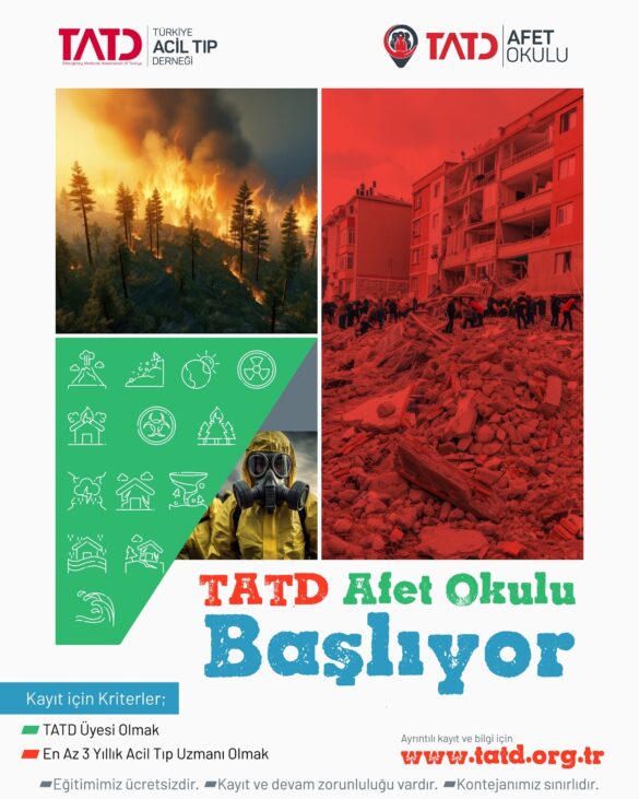 TATD Afet Okulu ilk eğitimine 20-22 Eylül 2024 tarihinde Point Hotel Taksim otelinde başlıyor. Her ay başka bir şehri gezecek olan TATD Afet Okulu eğitimimiz ücretsizdir. Katılım koşullarını sağlayan Acil Tıp uzmanları kontenjan dahilinde eğitime davet edilecektir. Bu özel eğitimin bir parçası olmak için devam zorunluluğu vardır. Ayrıntılar için [email protected] mail adresine mail atabilirsiniz.