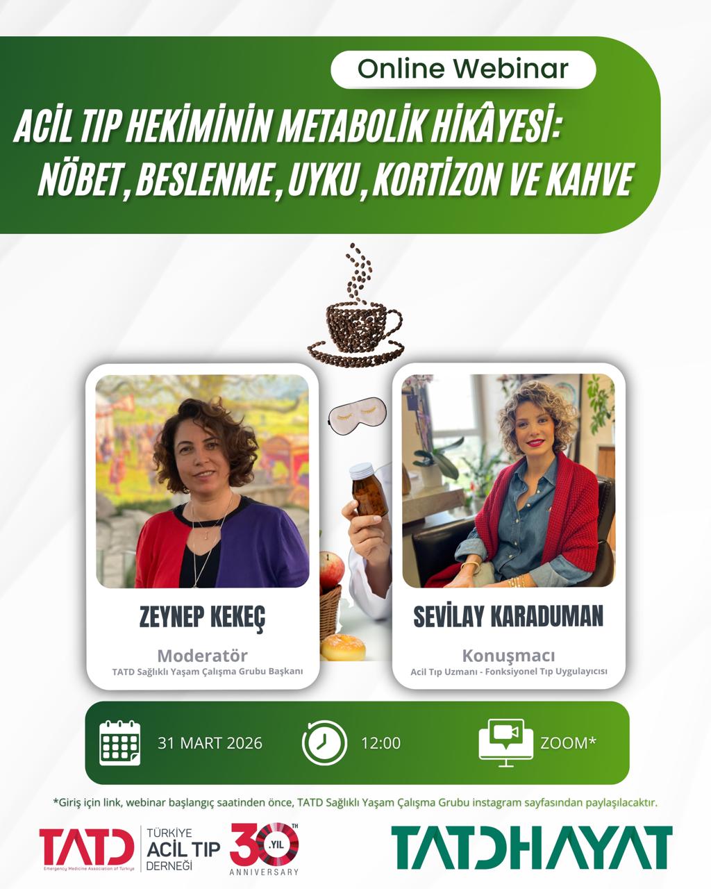 Türkiye Acil Tıp Derneği Sağlıklı Yaşam Çalışma Grubu olarak düzenlediğimiz “Acil Tıp Hekiminin Metabolik Hikâyesi: Nöbet, Beslenme, Uyku, Kortizon ve Kahve” başlıklı webinar, 31 Mart 2026 tarihinde saat 12:00’de Zoom üzerinden gerçekleştirilecektir.